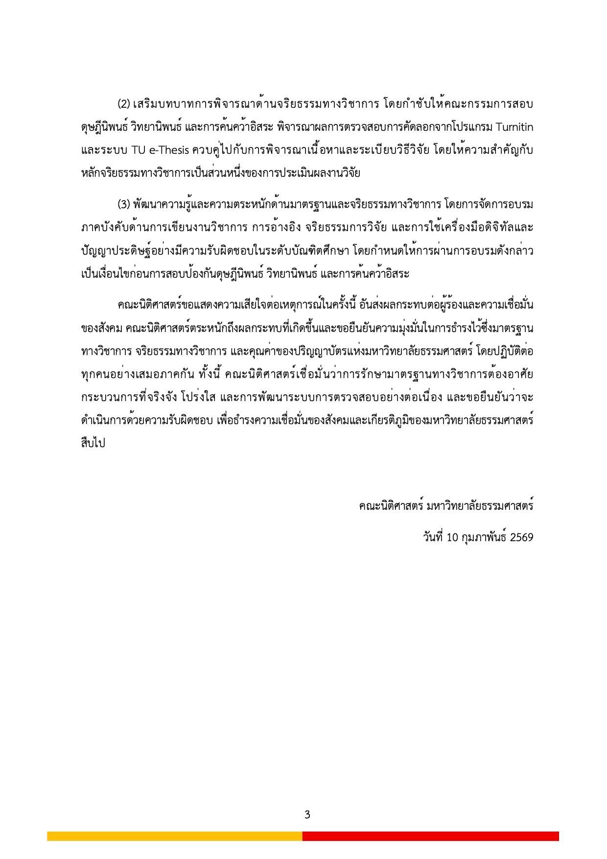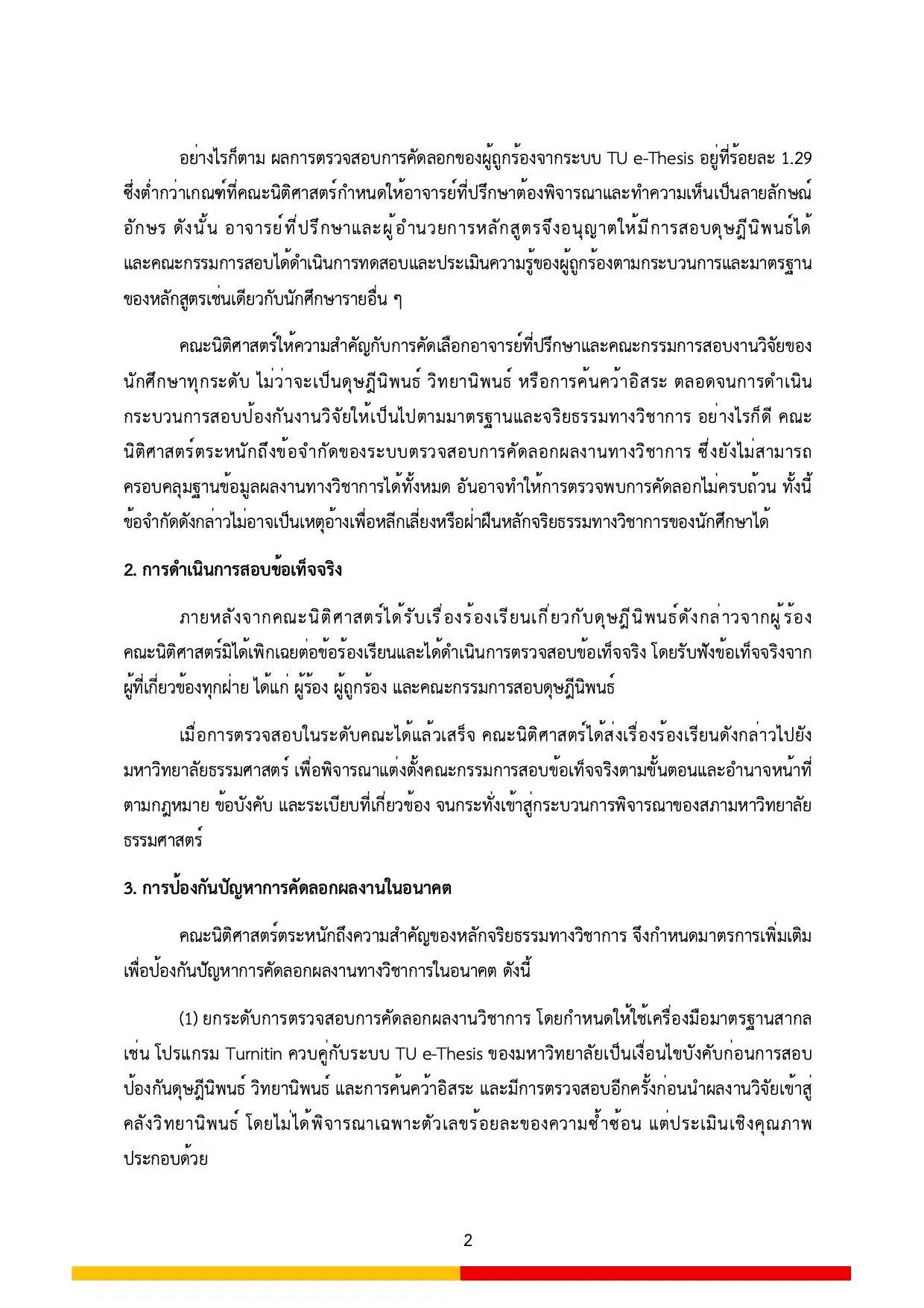 (2) เสริมบทบาทการพิจารณาด้านจริยธรรมทางวิชาการ โดยกำชับให้คณะกรรมการสอบดุษฎีนิพนธ์ วิทยานิพนธ์ และการค้นคว้าอิสระ พิจารณาผลการตรวจสอบการคัดลอกจากโปรแกรม Turnitin และระบบ TU e-Thesis ควบคู่ไปกับการพิจารณาเนื้อหาและระเบียบวิธีวิจัย โดยให้ความสำคัญกับหลักจริยธรรมทางวิชาการเป็นส่วนหนึ่งของการประเมินผลงานวิจัย