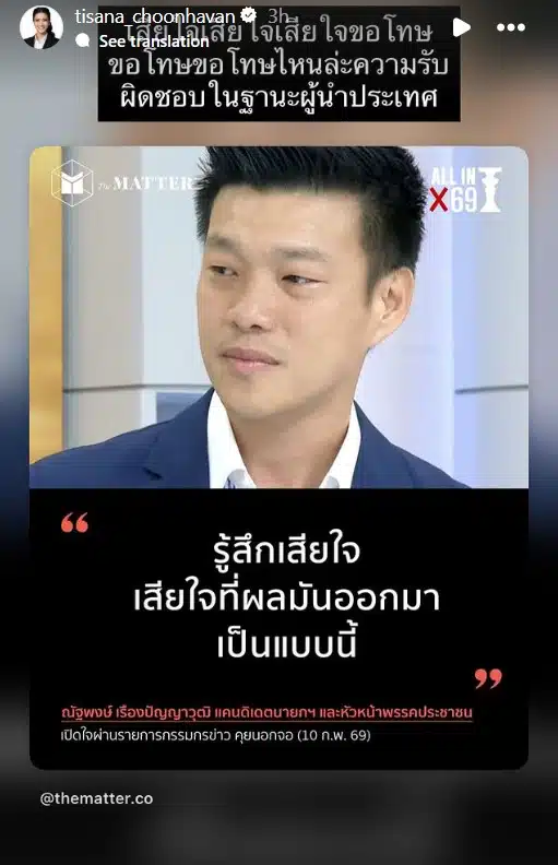 ในเวลาต่อมา ธิษะณา โพสต์สตอรี่อีกครั้ง โดยระบุว่า “เสียใจ เสียใจ เสียใจ ขอโทษ ขอโทษ ขอโทษ ไหนล่ะความรับผิดชอบในฐานะผู้นำประเทศ”