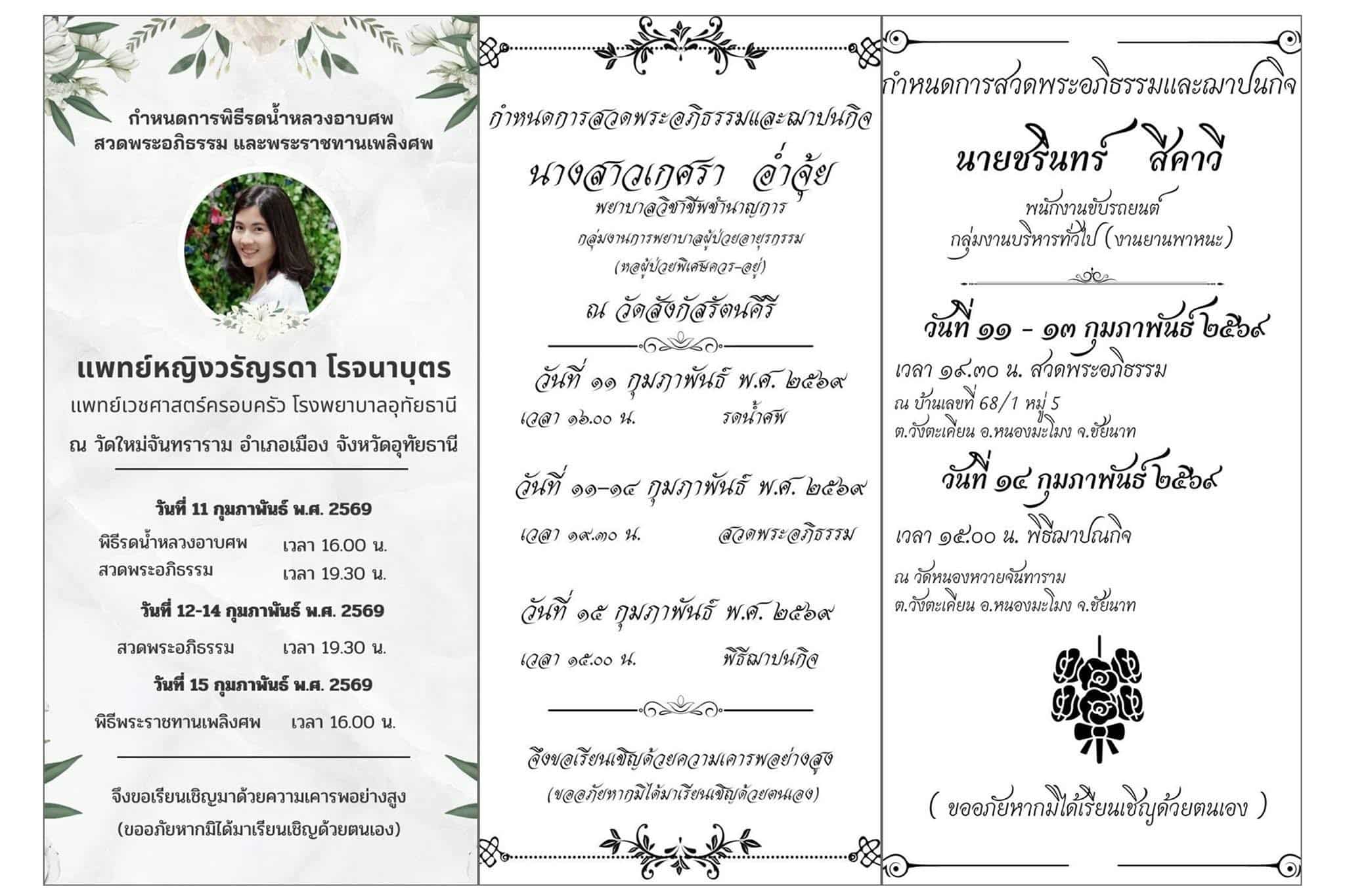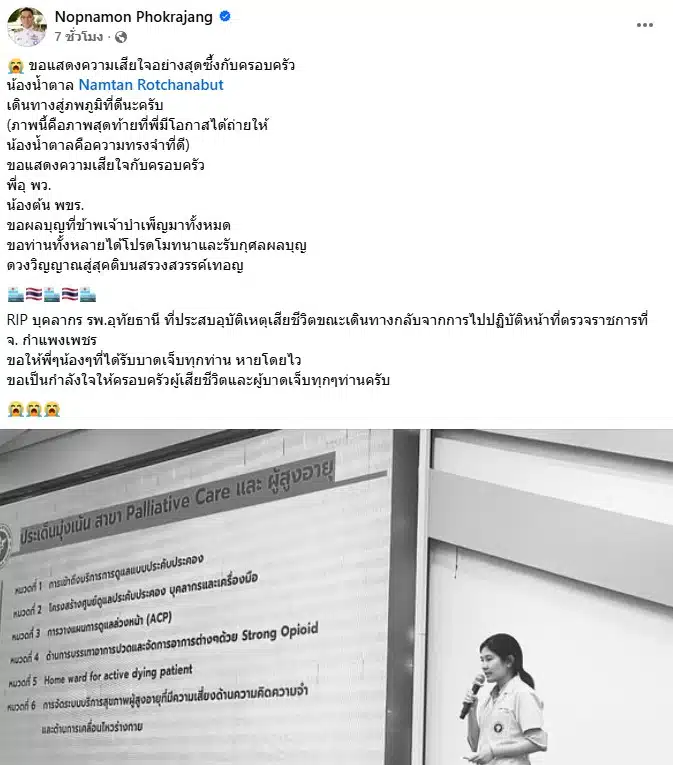 นอกจากนี้ ยังให้ข้อมูลเพิ่มเติมว่า “คุณหมอน้ำตาล กับพี่พยาบาลที่เสียชีวิต เป็นกำลังสำคัญในการขับเคลื่อนงานดูแลผู้ป่วยระยะประคับประคอง (palliative care) ของ รพ.อุทัยธานี และขับเคลื่อนงานระดับเขต ของเขตสุขภาพที่ 3 ทั้งสองท่านตั้งใจมาก และปีที่แล้วมีโอกาสได้ขับเคลื่อนงานเรื่องนี้ด้วยกัน เลยได้ทำงานด้วยกันอยู่ปีนึง รู้สึกใจหายเป็นอย่างมาก”