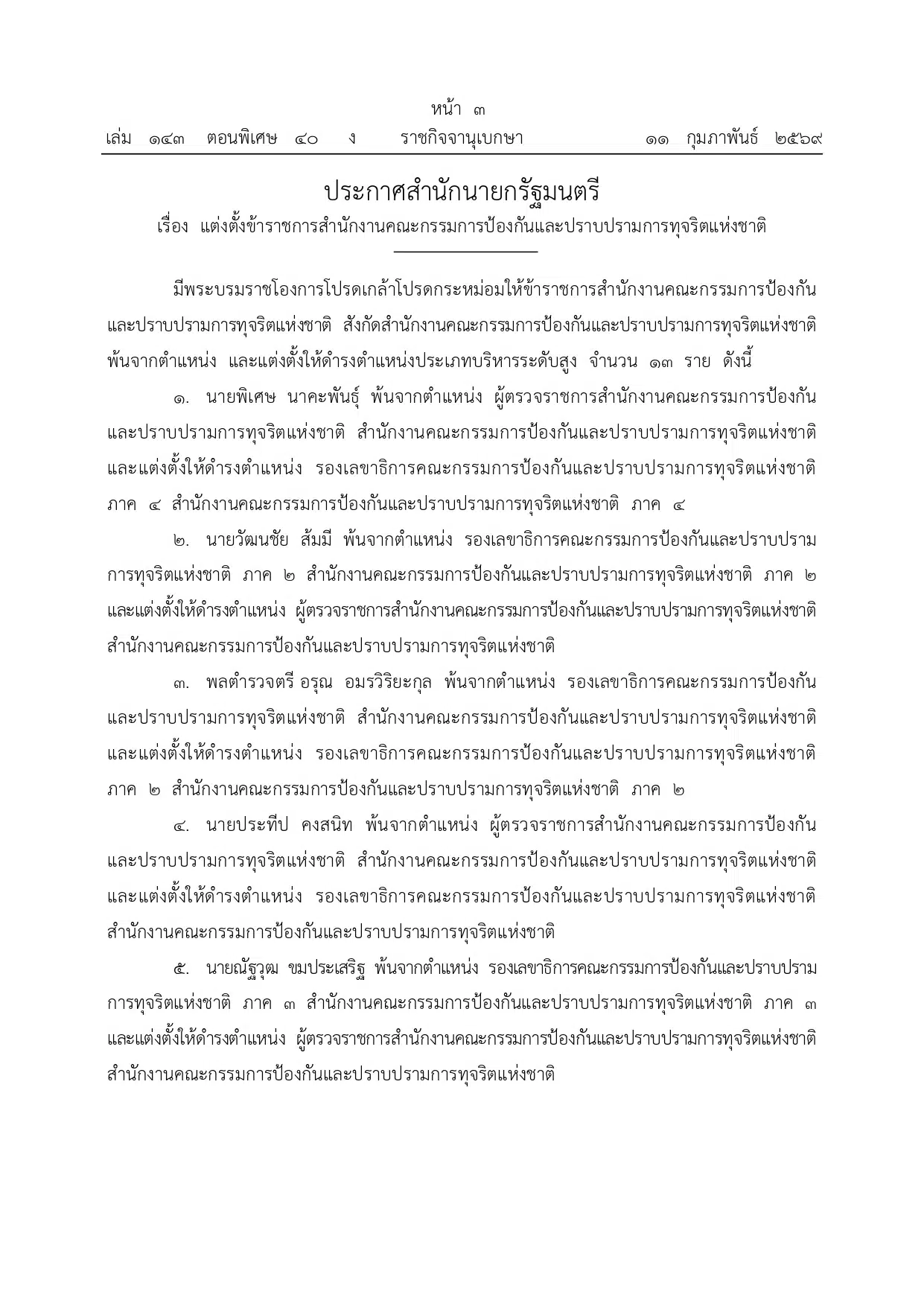 ราชกิจจาฯ ประกาศ โปรดเกล้าฯ แต่งตั้งข้าราชการ ป.ป.ช. ดำรงตำแหน่งใหม่ 13 ราย