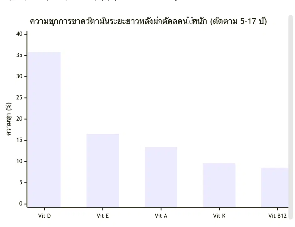 ต้องเป็นเพื่อนซี้กับ “วิตามิน” ไปตลอดชีวิต เพราะกระเพาะเล็กลงและทางเดินอาหารเปลี่ยนไป ร่างกายจะดูดซึมสารอาหารได้แย่ลงมาก งานวิจัยติดตามผลระยะยาวพบว่า ผู้ป่วยมักจะขาดวิตามินดี (พบมากถึง 35.8%), วิตามินบี 12, ธาตุเหล็ก และแคลเซียม ซึ่งถ้าปล่อยไว้อาจนำไปสู่ภาวะโลหิตจาง อ่อนเพลียเรื้อรัง หรือกระดูกพรุนได้เลย