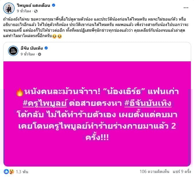 เรื่องราวยังไม่จบแค่นั้น เมื่อครูไพบูลย์เห็นฝ่ายหญิงไปให้สัมภาษณ์สื่อ ก็ได้ออกมาโพสต์ฟาดอีกระลอก ท้าให้สื่อมวลชนไปตามดูตัวและ “เช็กประวัติ” ของน้องเอิร์ธก่อนจะตัดสินตน
