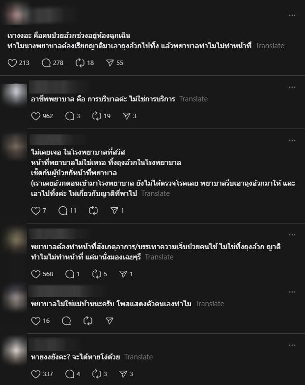 ในขณะที่ฝั่งไทยเน้นเรื่องการบริหารทรัพยากรบุคคลที่มีจำกัดก็มีมุมมองอีกด้านจากผู้ใช้โซเชียลที่โรงพยาบาลที่ต่างประเทศ เข้ามาแชร์ประสบการณ์เปรียบเทียบระบุว่า “ไม่เคยเจอ ในโรงพยาบาลที่สวิตเซอร์แลนด์ หน้าที่พยาบาลไม่ใช่เหรอ ทิ้งถุงอ้วกในโรงพยาบาล เช็ดก้นผู้ป่วยก็หน้าที่พยาบาล (เราเคยอ้วกตอนเข้ามาโรงพยาบาล ยังไม่ได้ตรวจโรคเลย พยาบาลรีบเอาถุงอ้วกมาให้ และเอาไปทิ้งค่ะ ไม่เกี่ยวกับญาติที่พาไป”