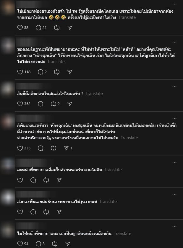 หลังจากโพสต์ดังกล่าวถูกแชร์ออกไป คอมเมนต์ส่วนใหญ่ต่างพุ่งเป้าไปที่การทำความเข้าใจบริบทของโรงพยาบาลรัฐและห้องฉุกเฉิน (ER) หลายคอมเมนต์ย้ำชัดว่า อาชีพพยาบาลคือการบริบาลเน้นการรักษาพยาบาลช่วยชีวิต ไม่ใช่งานบริการแบบโรงพยาบาลเอกชน