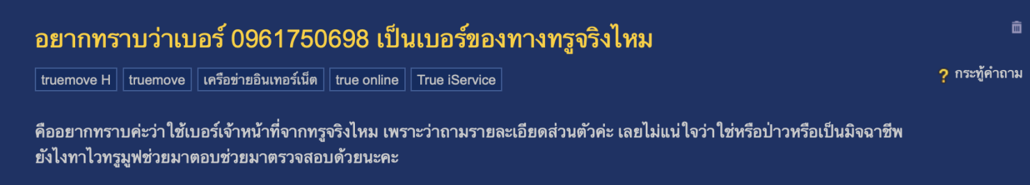 บัญชีทางการยืนยันว่า หมายเลข 0961750698 เป็นเบอร์ของเจ้าหน้าที่ทรูจริงๆ ไม่ใช่มิจฉาชีพแต่อย่างใด โดยจุดประสงค์ของการโทรคือเพื่อติดต่อแนะนำข้อมูลโปรโมชันและสิทธิพิเศษที่น่าสนใจเพิ่มเติมให้กับลูกค้านั่นเอง