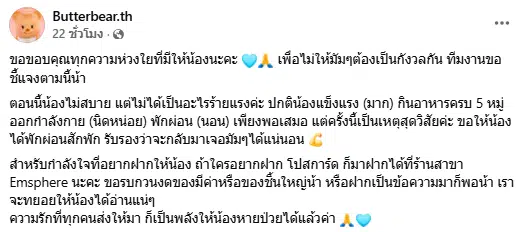 ต่อมาเพจ Butterbear.th โพสต์อัปเดตสาเหตุยกเลิกงานกะทันหัน โดยระบุว่า “ขอขอบคุณทุกความห่วงใยที่มีให้น้องนะคะ เพื่อไม่ให้มัมๆ ต้องเป็นกังวลกัน ทีมงานขอชี้แจงตามนี้น้า