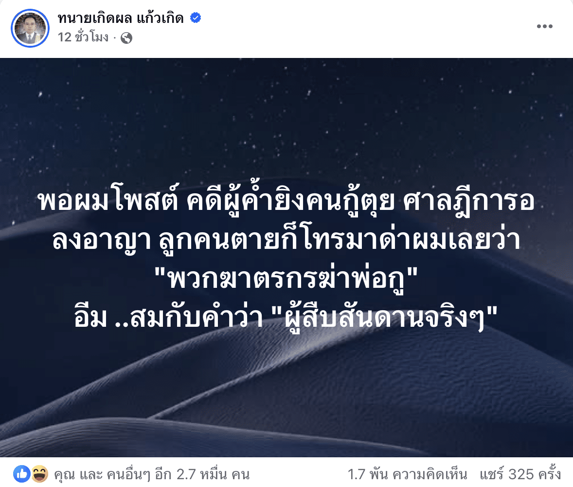 เมื่อคืนที่ผ่านมา ทนายเกิดผล แก้วเกิด ทนายความฝั่งจำเลย ได้ออกมาอัปเดตความเคลื่อนไหวผ่านเฟซบุ๊กส่วนตัวว่า หลังจากที่ตนโพสต์เล่าผลคำพิพากษาศาลฎีกาที่ให้รอลงอาญาในคดีนี้ออกไป ปรากฏว่าลูกของผู้ตาย ได้โทรศัพท์มาด่าทอด้วยความโกรธแค้น ต่อว่าทนายความด้วยประโยคที่รุนแรงว่า “พวกฆาตกรฆ่าพ่อกู”