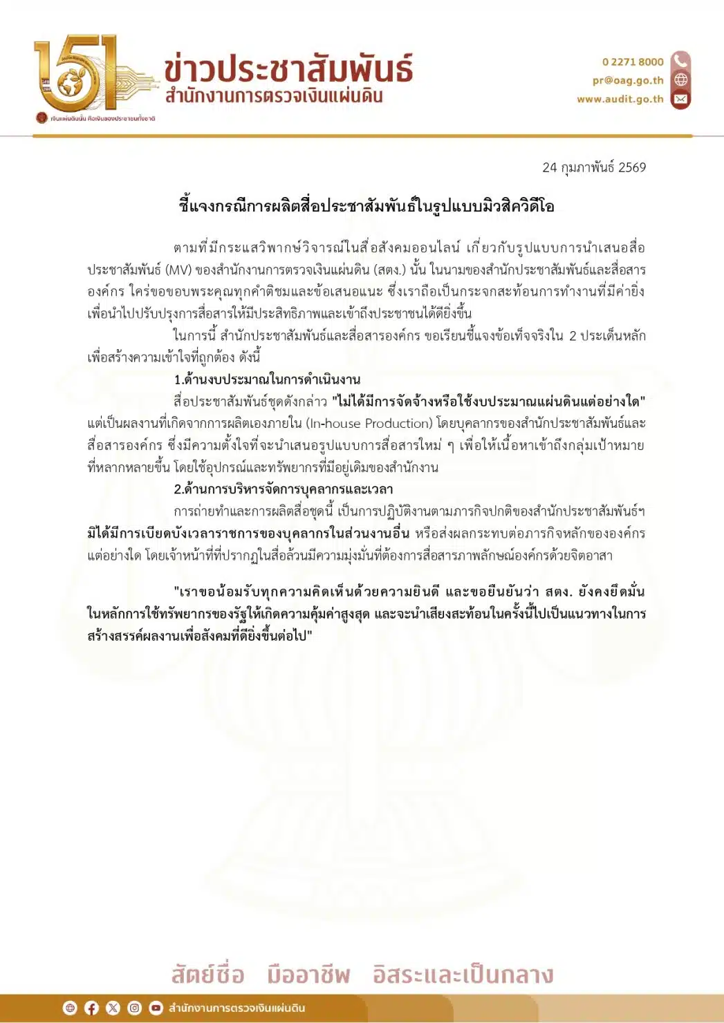 สตง. ออกแถลงชี้แจงการใช้งบทำ MV ยันไม่ได้มีการจัดจ้าง ทำเองในองค์กร