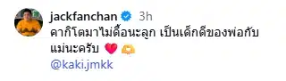 ล่าสุด 26 ก.พ. 69 แจ็ค แฟนฉัน ได้มีการโพสต์รูปนอนคู่กับลูกชาย น้องคากิ พร้อมระบุแคปชั่นว่า “คากิโตมาไม่ดื้อนะลูก เป็นเด็กดีของพ่อกับแม่นะครับ” นับว่าเป็นการเคลื่อนไหวแรกหลังประกาศยุติความสัมพันธ์กับอดีตภรรยา แต่ยังคงรักษาหน้าที่พ่อแม่อย่างดีที่สุด ท่ามกลางกำลังใจจากทั้งเพื่อนพี่น้องในวงการบันเทิง รวมถึงแฟนคลับที่ทราบเรื่องเข้ามาคอมเมนต์กันอย่างล้นหลาม