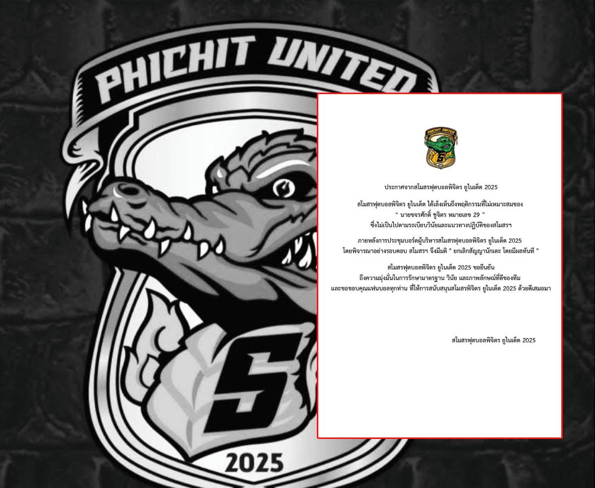 เดือดทะลุปรอท! สโมสรพิจิตร ยูไนเต็ด สั่งลงดาบสถานหนัก ประกาศยกเลิกสัญญา ขจรศักดิ์ ชูจิตร กองหลังเบอร์ 29 หลังก่อเหตุเล่นนอกเกมสุดเถื่อน ทั้งเจตนาย่ำและเตะใส่ผู้เล่นอุตรดิตถ์ เอฟซี จนเกมหยุดชะงักนานนับ 10 นาที ชี้พฤติกรรมขัดต่อวินัยและภาพลักษณ์สโมสรอย่างร้ายแรง
