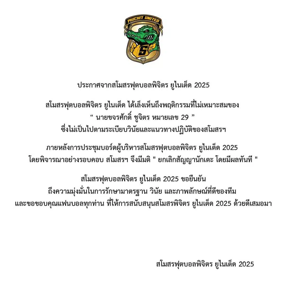 บอร์ดบริหารสโมสรพิจิตร ยูไนเต็ด ไม่นิ่งนอนใจต่อเหตุการณ์ที่เกิดขึ้น ล่าสุดแถลงการณ์อย่างเป็นทางการโดยระบุว่า สโมสรเล็งเห็นถึงพฤติกรรมที่ไม่เหมาะสมและไม่เป็นไปตามระเบียบวินัยของขจรศักดิ์ ชูจิตร จึงมีมติ “ยกเลิกสัญญา” นักเตะรายนี้โดยให้มีผลในทันที