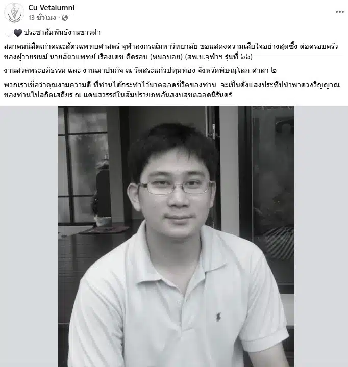 อาลัย หมอบอย สัตวแพทย์จุฬาฯ เสียชีวิต สมาคมนิสิตเก่าฯ ยกย่องคุณงามความดีตลอดช่วงชีวิต เปิดกำหนดการสวดพระอภิธรรมและฌาปนกิจ ณ วัดสระแก้วปทุมทอง จ.พิษณุโลก