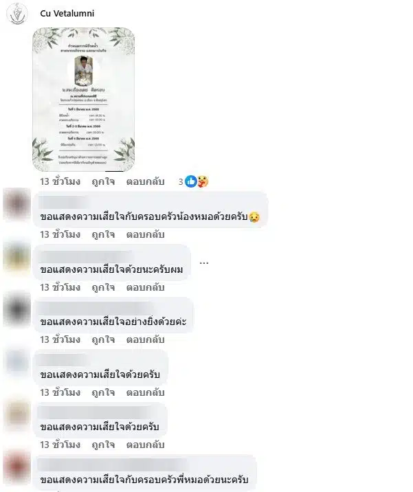 วานนี้ (1 มีนาคม 2569) เพจ Cu Vetalumni หรือสมาคมนิสิตเก่าคณะสัตวแพทยศาสตร์ จุฬาลงกรณ์มหาวิทยาลัย ออกมาโพสต์ข้อความแสดงความเสียใจอย่างสุดซึ้งต่อการจากไปของ หมอบอย หรือ นายสัตวแพทย์ เรืองเดช คิดรอบ สัตวแพทยศาสตรบัณฑิต รุ่นที่ 66