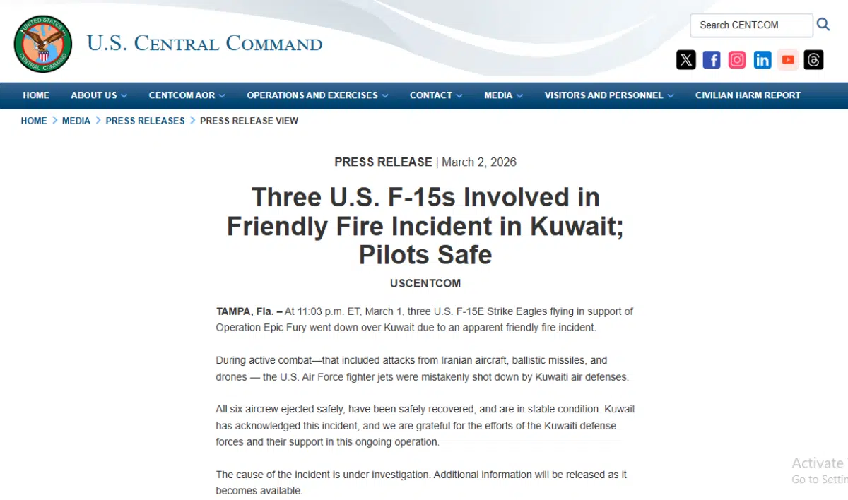 ทั้งนี้ กองบัญชาการกลางสหรัฐฯ (USCENTCOM) แถลงยืนยันเหตุการณ์ระทึกขวัญ เครื่องบินขับไล่โจมตี F-15E Strike Eagle จำนวน 3 ลำ ถูกยิงตกระหว่างปฏิบัติภารกิจสนับสนุน “Operation Epic Fury” เหนือน่านฟ้าคูเวต เมื่อช่วงดึกของวันที่ 1 มี.ค.ที่ผ่านมา ผลการตรวจสอบเบื้องต้นพบว่าเป็นเหตุ “ยิงกันเอง” จากความผิดพลาดของระบบป้องกันภัยทางอากาศคูเวต ท่ามกลางบรรยากาศการสู้รบที่สับสนวุ่นวาย