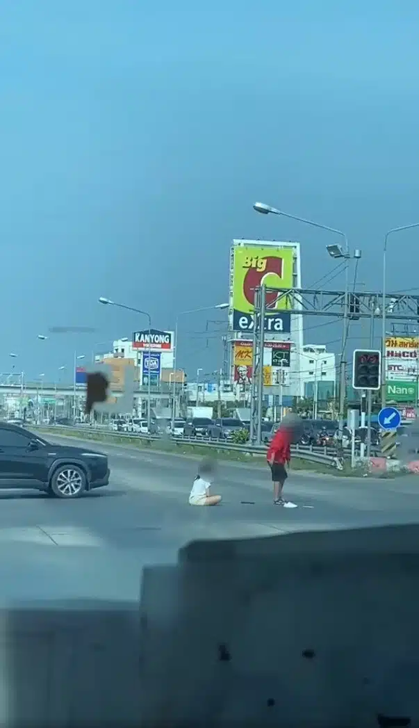 หวั่นอันตราย! สาวงอนแฟนนั่งกลางแยก ปาของ-เขวี้ยงรองเท้าใส่ เหตุมอเตอร์ไซต์ดับ แต่ฝ่ายชายไม่กล้าเข็นข้ามฝั่ง
