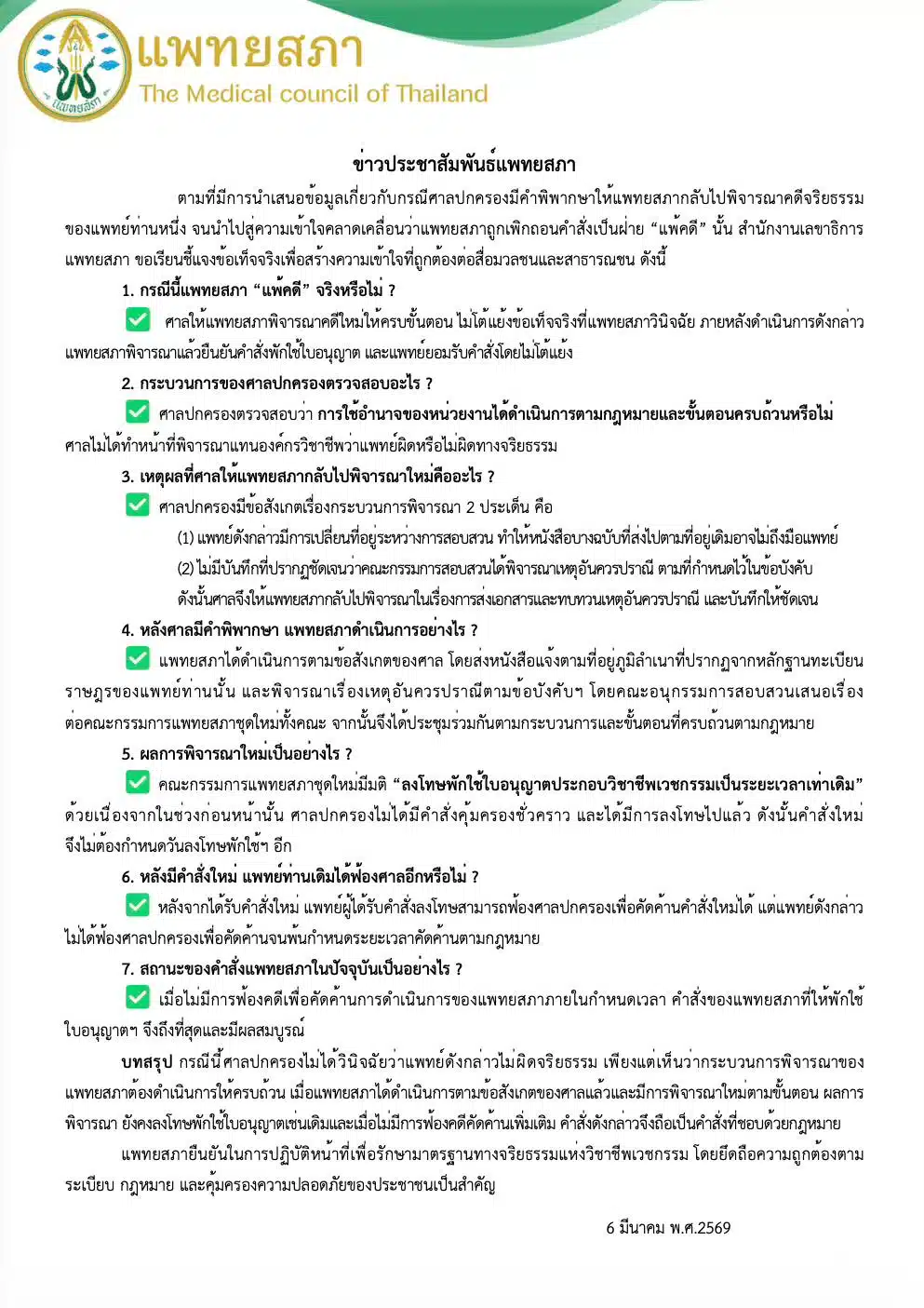 จากกรณีที่มีข่าวลือและเกิดความเข้าใจคลาดเคลื่อนว่า “แพทยสภา” เป็นฝ่ายแพ้คดีในชั้นศาลปกครอง กรณีการพิจารณาคดีจริยธรรมของแพทย์คนดัง (หมอของขวัญ) ล่าสุดเมื่อวันที่ 6 มีนาคม 2569 สำนักงานเลขาธิการแพทยสภาได้ออกแถลงการณ์ชี้แจงข้อเท็จจริงทั้งหมดเพื่อสร้างความเข้าใจที่ถูกต้องแก่สาธารณชน ยืนยันชัดเจนว่าแพทยสภาไม่ได้แพ้คดี และศาลปกครองก็ไม่ได้วินิจฉัยว่าแพทย์รายดังกล่าวไม่มีความผิดทางจริยธรรมแต่อย่างใด