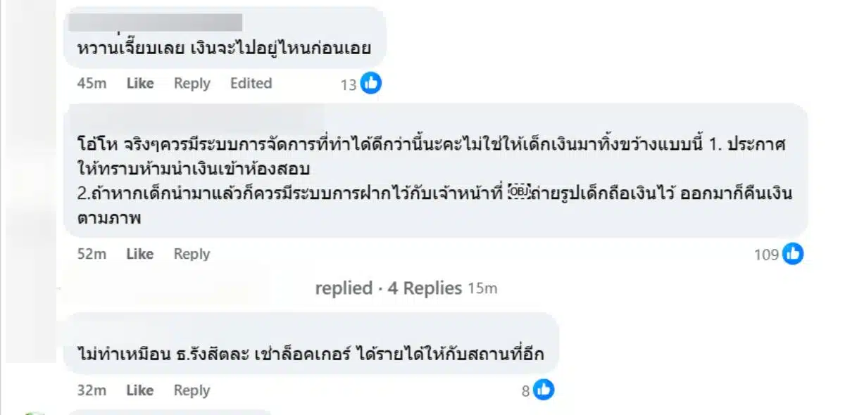 นอกจากนี้เสียงตำหนิยังระบุชัดถึงการที่ไม่มีจุดรับฝาก โดยโลกออนไลน์ตั้งข้อสังเกต หากโรงเรียนเข้มงวดเรื่องความปลอดภัยและการทุจริต ควรจัดให้มีจุดรับฝากของที่เป็นระบบ แทนการปล่อยให้เด็กต้องทิ้งทรัพย์สินไว้ตามยถากรรม