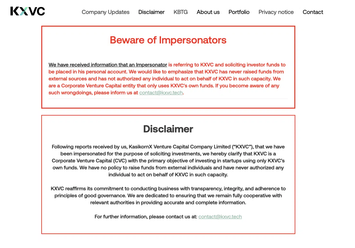 KXVC กองทุนร่วมลงทุน (Venture Capital) ออกประกาศเตือนนักลงทุนให้ใช้ความระมัดระวังต่อมิจฉาชีพที่แอบอ้างชื่อบริษัท เพื่อหลอกลวงให้ร่วมลงทุนหรือโอนเงินและทรัพย์สิน โดยอ้างว่าเป็นตัวแทนของบริษัทหรือบุคลากรที่เกี่ยวข้องกับ KXVC