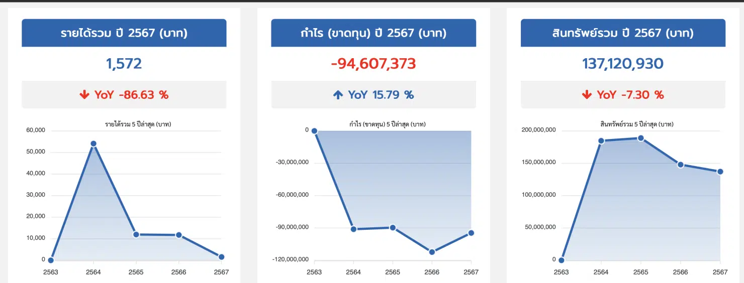 ในส่วนของผลกำไร ในปี 2567 บริษัทแจ้งผลกำไรสุทธิติดลบมหาศาลถึง -94,607,372.96 บาท (หรือขาดทุนกว่า 94.6 ล้านบาท) ซึ่งกราฟย้อนหลังแสดงให้เห็นชัดเจนว่า บริษัทแบกรับภาวะขาดทุนหนักระดับ 90 – 110 ล้านบาทมาอย่างต่อเนื่องทุกปีนับตั้งแต่เปิดกิจการ