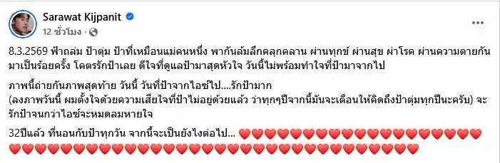 ไอซ์ สารวัตร ผู้ประกาศข่าวช่อง 8 โพสต์ข้อความเศร้า อาลัย ป้าตุ่ม เผยความผูกพันดูแลกันมา 32 ปี พร้อมคำมั่นสัญญาจะรักตลอดไป
