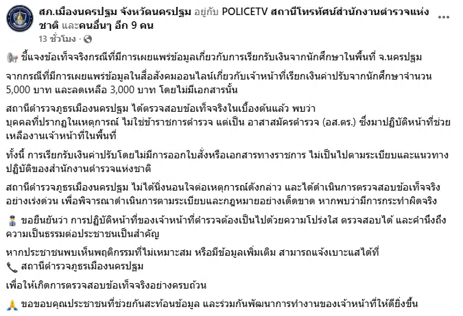 จากกรณีที่มีการเผยแพร่ข้อมูลในสื่อสังคมออนไลน์เกี่ยวกับเจ้าหน้าที่เรียกเงินค่าปรับจากนักศึกษาจำนวน 5,000 บาท และลดเหลือ 3,000 บาท โดยไม่มีเอกสารนั้น สถานีตำรวจภูธรเมืองนครปฐม ได้ตรวจสอบข้อเท็จจริงในเบื้องต้นแล้ว พบว่า บุคคลที่ปรากฏในเหตุการณ์ ไม่ใช่ข้าราชการตำรวจ แต่เป็น อาสาสมัครตำรวจ (อส.ตร.) ซึ่งมาปฏิบัติหน้าที่ช่วยเหลืองานเจ้าหน้าที่ในพื้นที่