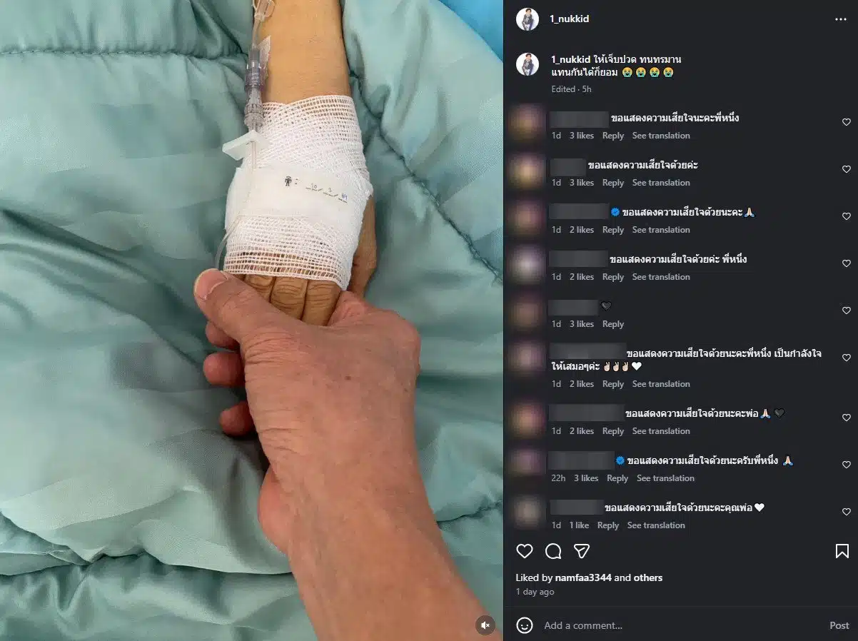 ขณะเดียวกัน หนึ่ง นึกคิด สามีของ มุกดา บุญทอง ได้โพสต์ข้อความจากลาคู่ชีวิตที่ครองรักกันมายาวนานผ่านอินสตาแกรม 1_nukkid เผยความในใจว่า “ให้เจ็บปวด ทนทรมานแทนกันได้ก็ยอม” พร้อมแนบภาพที่ตนกุมมือภรรยาไว้ไม่ห่าง