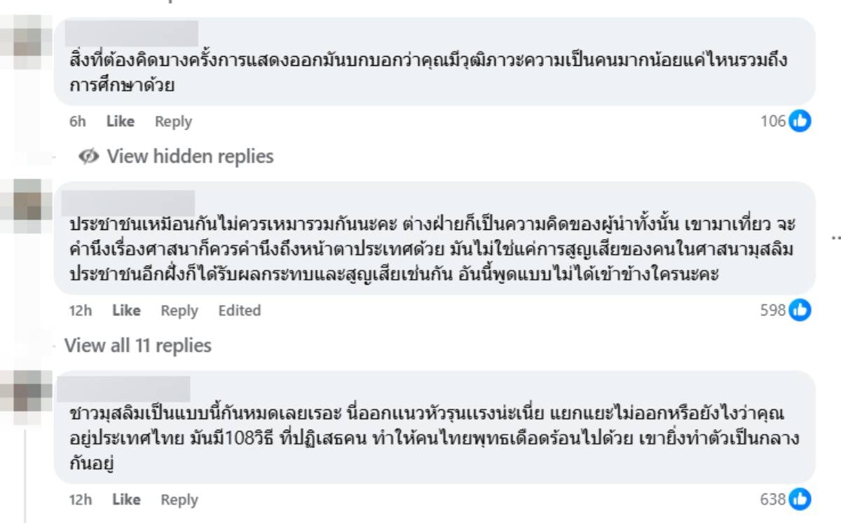 “ประชาชนเหมือนกันไม่ควรเหมารวมกันนะคะ ต่างฝ่ายก็เป็นความคิดของผู้นำทั้งนั้น เขามาเที่ยว จะคำนึงเรื่องศาสนาก็ควรคำนึงถึงหน้าตาประเทศด้วย มันไม่ใช่แค่การสูญเสียของคนในศาสนามุสลิม ประชาชนอีกฝั่งก็ได้รับผลกระทบและสูญเสียเช่นกัน อันนี้พูดแบบไม่ได้เข้าข้างใครนะคะ”