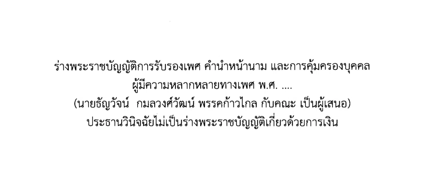 ทั้งนี้ ผูั้สื่อข่าวรายงานเพิ่มเติม มาตรา 10 ที่ แพรี่ ไพรวัลย์ ยกมา เป็น ร่างพระราชบัญญัติการรับรองเพศ คำนำหน้านาม และการคุ้มครองบุคคลผู้มีความหลากหลายทางเพศ พ.ศ. …. ซึ่งเสนอโดย นายธัญวัจน์ กมลวงศ์วัฒน์ กับคณะ ร่างกฎหมายที่เปิดรับฟังความคิดเห็นในระบบมาตรา 77 ของรัฐสภา แต่ไม่ผ่านความเห็นชอบจากสภาผู้แทนราษฎร