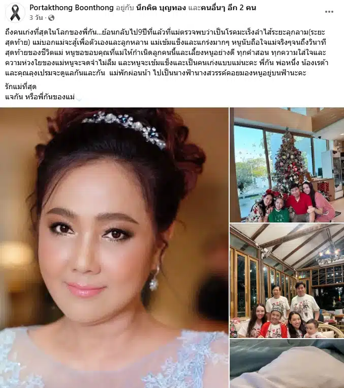 “ถึงคนเก่งที่สุดในโลกของพี่กัน…ย้อนกลับไป 9 ปีที่แล้วที่แม่ตรวจพบว่าเป็นโรคมะเร็งลำไส้ระยะลุกลาม (ระยะสุดท้าย) แม่บอกแม่จะสู้เพื่อตัวเองและลูกหลาน แม่เข้มแข็งและแกร่งมาก ๆ หนูนับถือใจแม่จริง ๆ จนถึงวินาทีสุดท้ายของชีวิตแม่