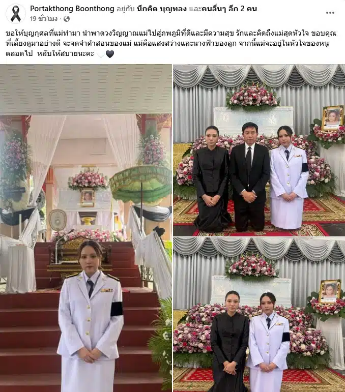 หนูขอขอบคุณที่แม่ให้กำเนิดลูกคนนี้และเลี้ยงหนูอย่างดี ทุกคำสอน ทุกความใส่ใจและความห่วงใยของแม่หนูจะจดจำไม่ลืม และหนูจะเข้มแข็งและเป็นคนเก่งแบบแม่นะคะ พี่กัน พ่อหนึ่ง น้องเรด้าและคุณลุงเปรมจะดูแลกันและกัน แม่พักผ่อนน้า ไปเป็นนางฟ้านางสวรรค์คอยมองหนูอยู่บนฟ้านะคะ