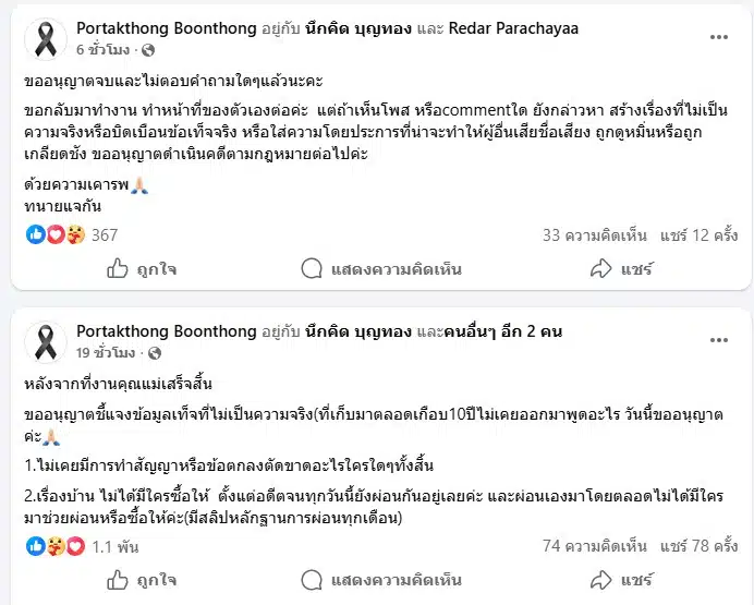 หลังจากเสร็จสิ้นพิธีอำลา คุณแม่มุกดา บุญทอง ฝั่ง แจกัน ปอถักทอง ลูกสาวและมีดีกรีเป็นถึงทนายความ ตัดสินใจประกาศข้อมูลที่เก็บเงียบมาเกือบ 10 ปี เพื่อไม่ให้สังคมเข้าใจผิด ยืนยันว่าไม่เคยมีการทำสัญญาหรือข้อตกลงตัดขาดความสัมพันธ์กับใครทั้งสิ้น พร้อมปฏิเสธข่าวลือที่มีคนซื้อบ้านให้ ซึ่งครอบครัวช่วยกันผ่อนเองมาโดยตลอดตั้งแต่อดีตจนถึงปัจจุบัน และมีหลักฐานสลิปการโอนเงินยืนยันทุกเดือน ไม่เคยมีใครมาช่วยซัพพอร์ต