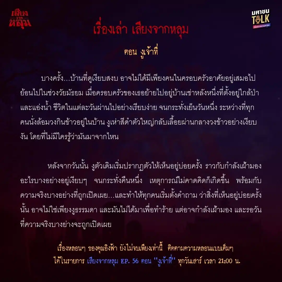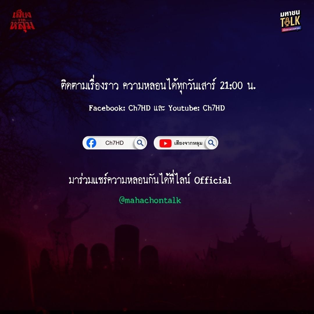 ส่วนใครที่มีเรื่องราวสยองขวัญที่อยากมาแชร์ สามารถแอดไลน์มาเล่าได้ที่ @mahachontalk พบกับรายการ
