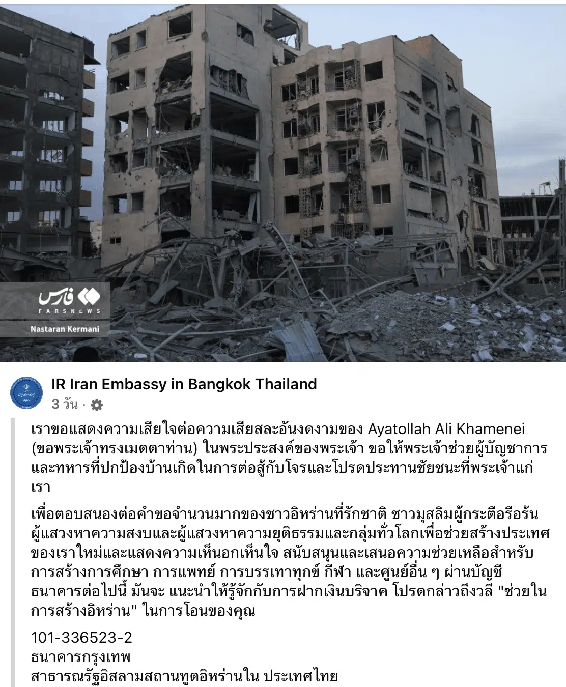 สถานทูตอิหร่านประจำไทย เปิดบัญชีรับบริจาคด่วน ระดมทุนฟื้นฟูประเทศหลังสูญเสียผู้นำสูงสุด 3 วันต่อมา สถานทูตอิหร่านในแอฟริกาใต้ โพสต์ล้อลูกเรือไทย มยุรีนารี