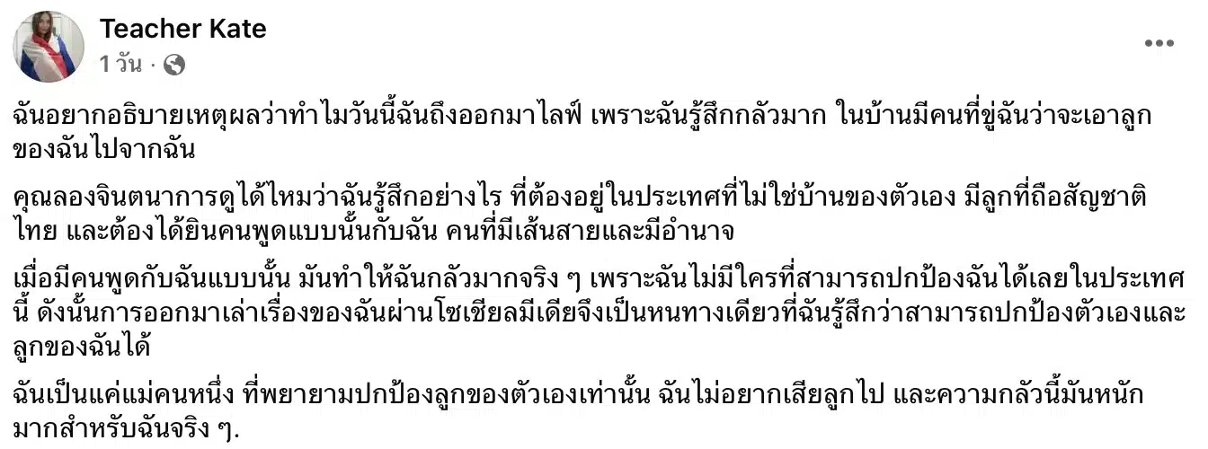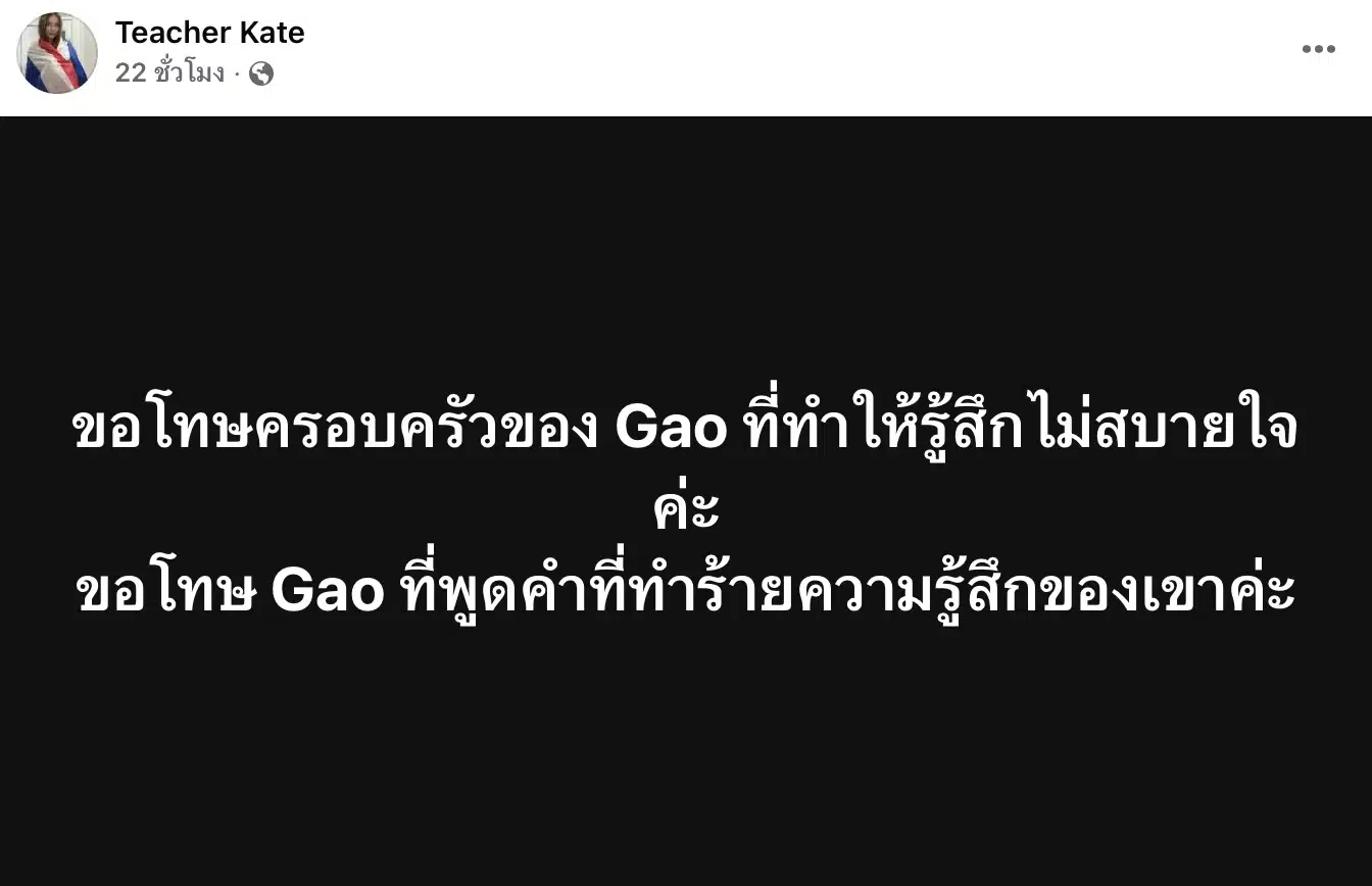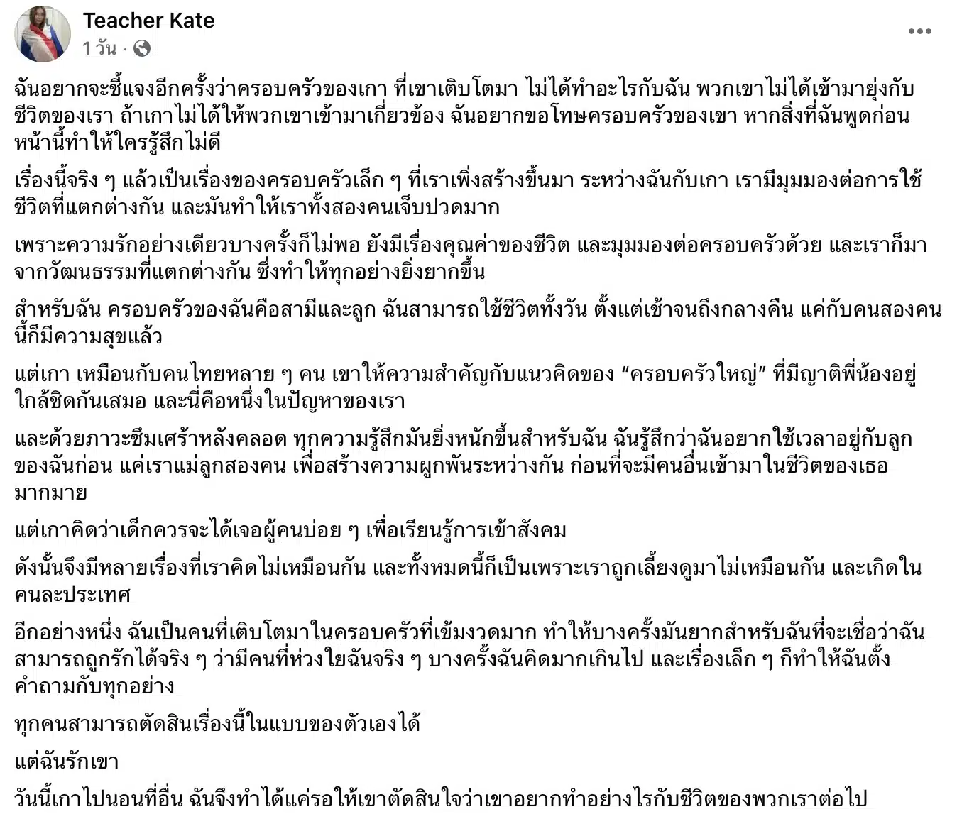 “จากกรณีที่คุณเคท ภรรยาชาวต่างชาติของน้องเก้า เกริกพล ได้ออกมาไลฟ์สดและกล่าวถึงครอบครัวของเราในหลายประเด็นนั้น