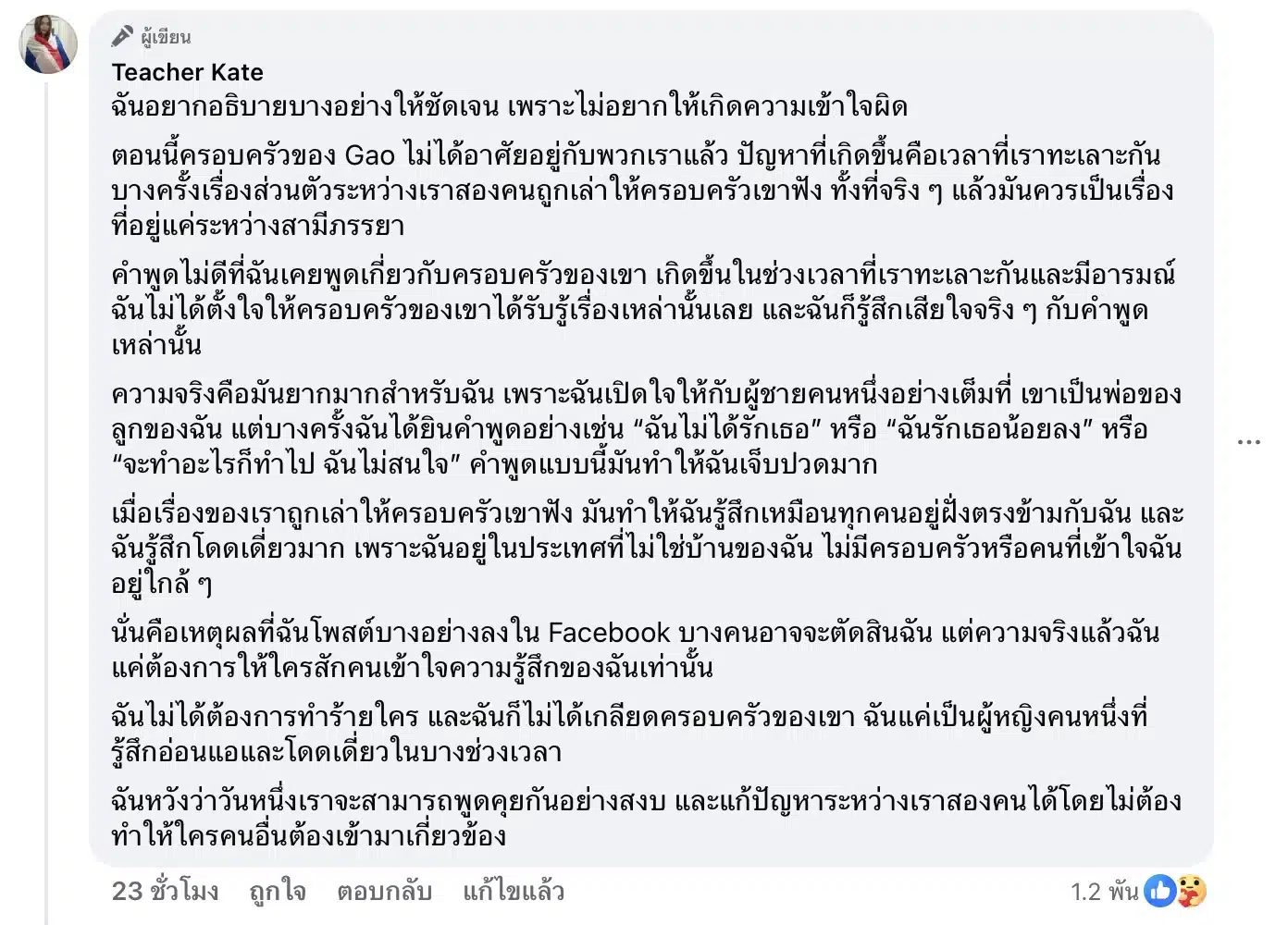 พร้อมโพสต์เพิ่มเติมใต้คอมเมนต์ “ฉันอยากอธิบายบางอย่างให้ชัดเจน เพราะไม่อยากให้เกิดความเข้าใจผิด ตอนนี้ครอบครัวของ Gao ไม่ได้อาศัยอยู่กับพวกเราแล้ว ปัญหาที่เกิดขึ้นคือเวลาที่เราทะเลาะกัน บางครั้งเรื่องส่วนตัวระหว่างเราสองคนถูกเล่าให้ครอบครัวเขาฟัง ทั้งที่จริง ๆ แล้วมันควรเป็นเรื่องที่อยู่แค่ระหว่างสามีภรรยา