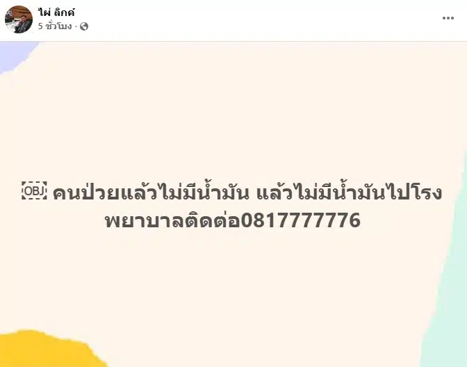 นายไผ่ ยังโพสต์อีกข้อความสำหรับผู้ที่เดือดร้อนด้านการเดินทางในพื้นที่ว่า “คนป่วยแล้วไม่มีน้ำมัน แล้วไม่มีน้ำมันไปโรงพยาบาลติดต่อ 0817777776” พร้อมระบุว่า “ในเขต 1 กำแพงเพชรก่อนนะครับ” เพื่อให้ผู้ที่มีความจำเป็นเร่งด่วนสามารถขอความช่วยเหลือได้