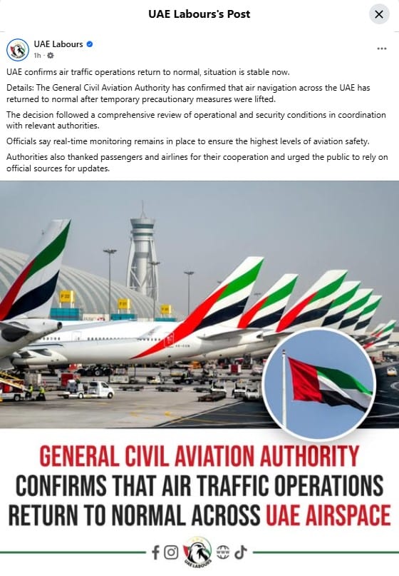 GCAA แถลงยืนยันการเปิดน่านฟ้าให้เที่ยวบินสัญจรตามปกติ หลังปิดไปประมาณ 2 ชั่วโมง เจ้าหน้าที่ตัดสินใจเปิดน่านฟ้าหลังประเมินสภาพปฏิบัติการและความมั่นคงอย่างรอบด้าน GCAA ยืนยันว่าหน่วยงานที่เกี่ยวข้องยังคงเฝ้าติดตามสถานการณ์แบบเรียลไทม์เพื่อรักษาความปลอดภัยสูงสุด