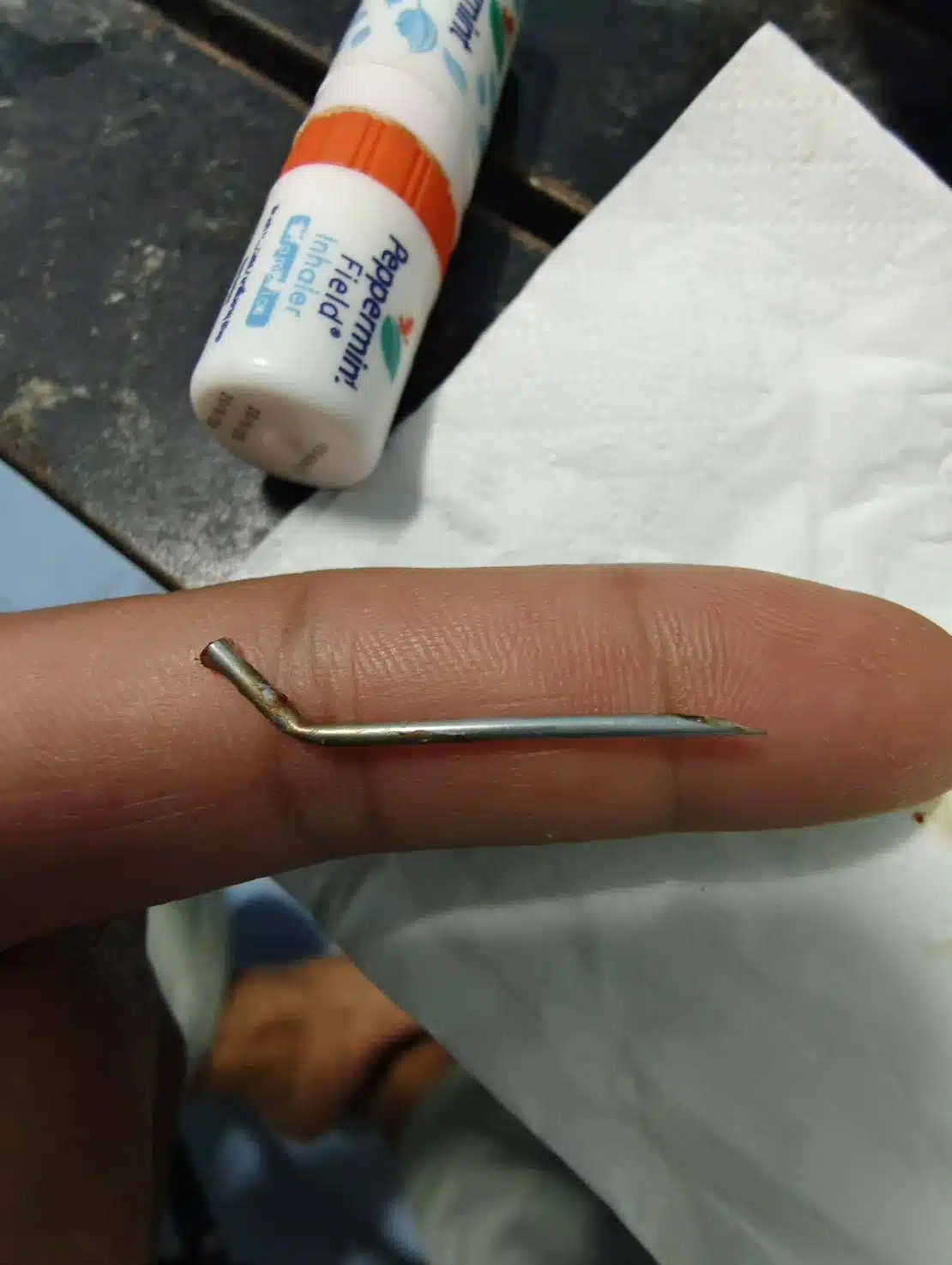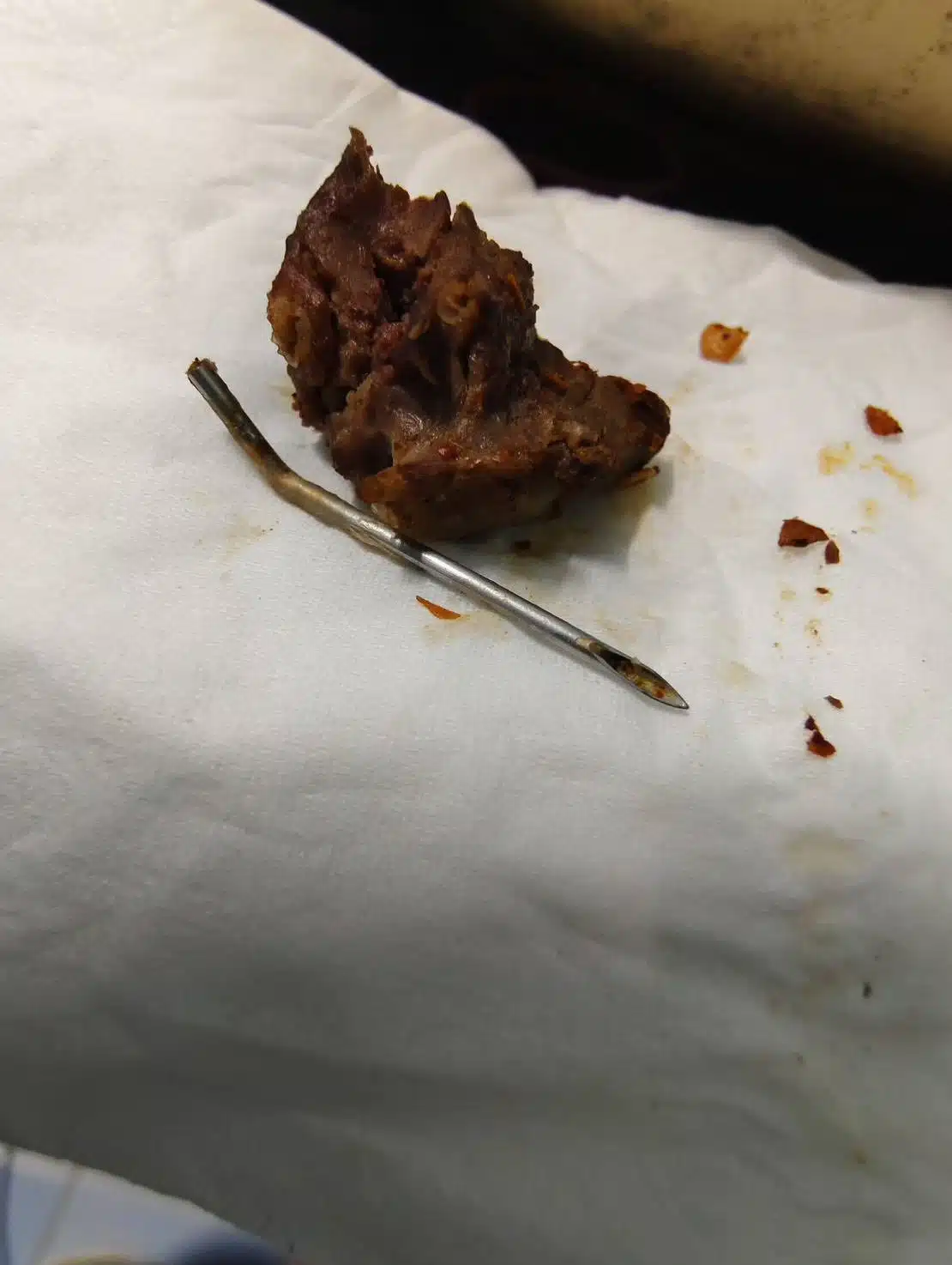 กลายเป็นเข็มฉีดยาขนาดใหญ่เท่าไม้จิ้มฟัน จบกันต้มเนื้อมื้อค่ำ… โชคดีที่สังเกตเห็นก่อนทานและกลืนลงคอ จึงฝากเตือนให้ดูก่อนกิน ส่วนร้านค้าก็ควรเช็ดก่อนปรุงเพื่อความปลอดภัย ร้านค้าคงไม่ทราบว่ามีติดชิ้นเนื้อมา”