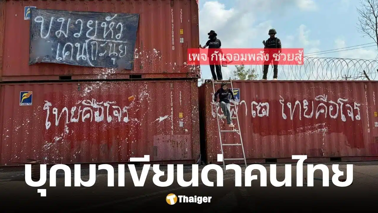 กัน จอมพลัง เปิดวงจรปิดมัดตัว คนเขมรบุกพ่นสีรั้วตู้คอนเทนเนอร์ชายแดนด่า “ไทยคือโจร” หวิดปะทะเดือดขณะทีมงานลงพื้นที่ทาสีทับ ลั่น ยั่วยุกัน ขยันเขียนก็จะขยันลบ