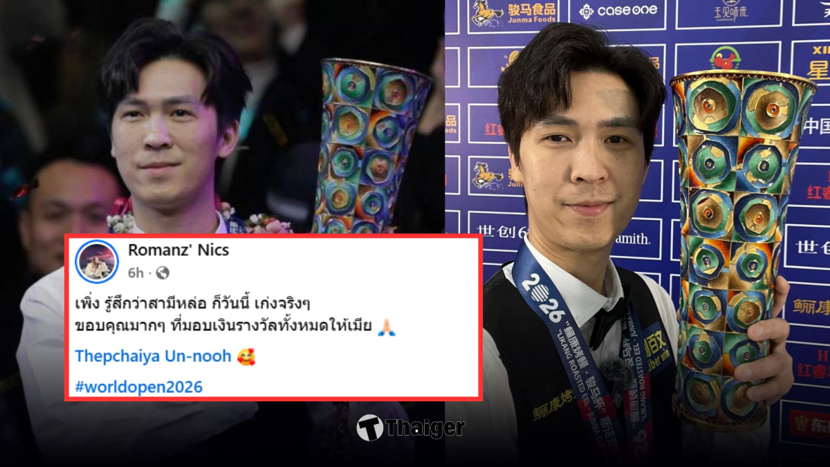 “เอฟวัน” เทพไชยา อุ่นหนู สร้างประวัติศาสตร์โค่น รอนนี่ โอซุลลิแวน 10-7 เฟรม คว้าแชมป์เวิลด์ โอเพ่น 2026 รายการเก็บคะแนนครั้งแรกในรอบหลายปี พร้อมโชว์แม็กซิมัมเบรกสุดสวยในรอบชิงชนะเลิศที่จีน ก่อนพาไปดูโพสต์สุดอบอุ่นจากหลังบ้านคนสำคัญ
