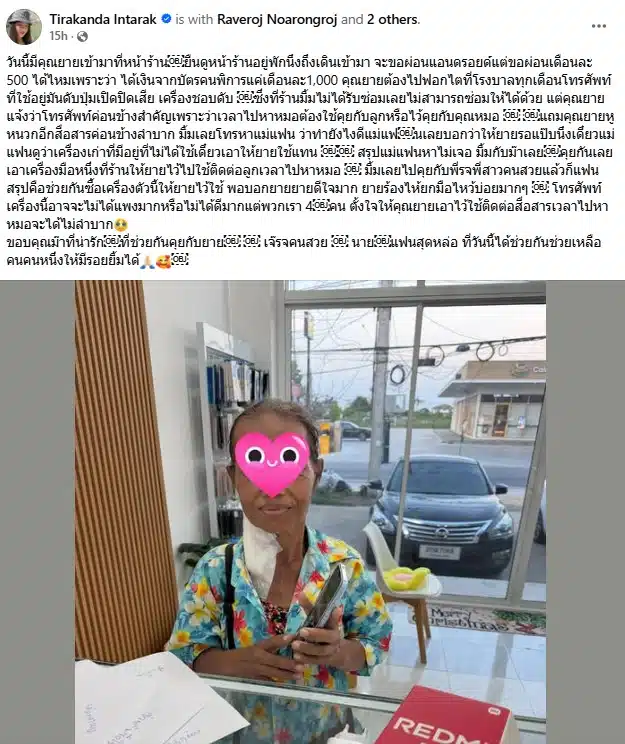 เมื่อวันอาทิตย์ที่ 22 มีนาคม 2569 ผู้ใช้งานเฟซบุ๊กชื่อ Tirakanda Intarak หรือ คุณมิ้ม โพสต์เล่าเหตุการณ์ที่เกิดขึ้นบริเวณร้านโทรศัพท์มือถือของตนเอง โดยระบุว่า มีคุณยายท่านหนึ่งเดินเข้ามาสอบถามเพื่อขอผ่อนโทรศัพท์มือถือระบบแอนดรอยด์ (Android) ในราคาเดือนละ 500 บาท เนื่องจากหญิงชราได้รับเงินช่วยเหลือจากบัตรประจำตัวคนพิการเพียงเดือนละ 1,000 บาทเท่านั้น