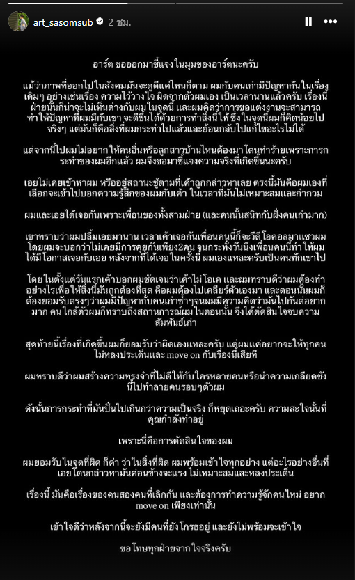ล่าสุด “ไฮโซอาร์ต” ไม่อาจปล่อยให้เรื่องบานปลายไปกว่านี้ ได้ออกมาโพสต์ร่ายยาวชี้แจงความจริงในมุมของตัวเองแบบแมนๆ เพื่อปกป้องคนรอบข้าง