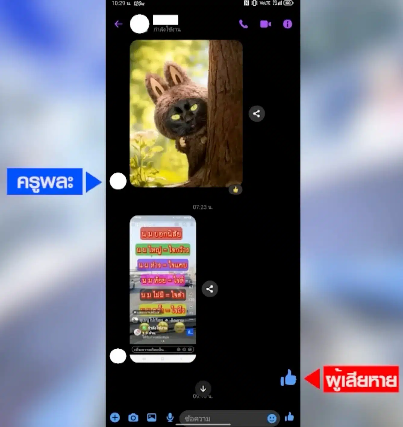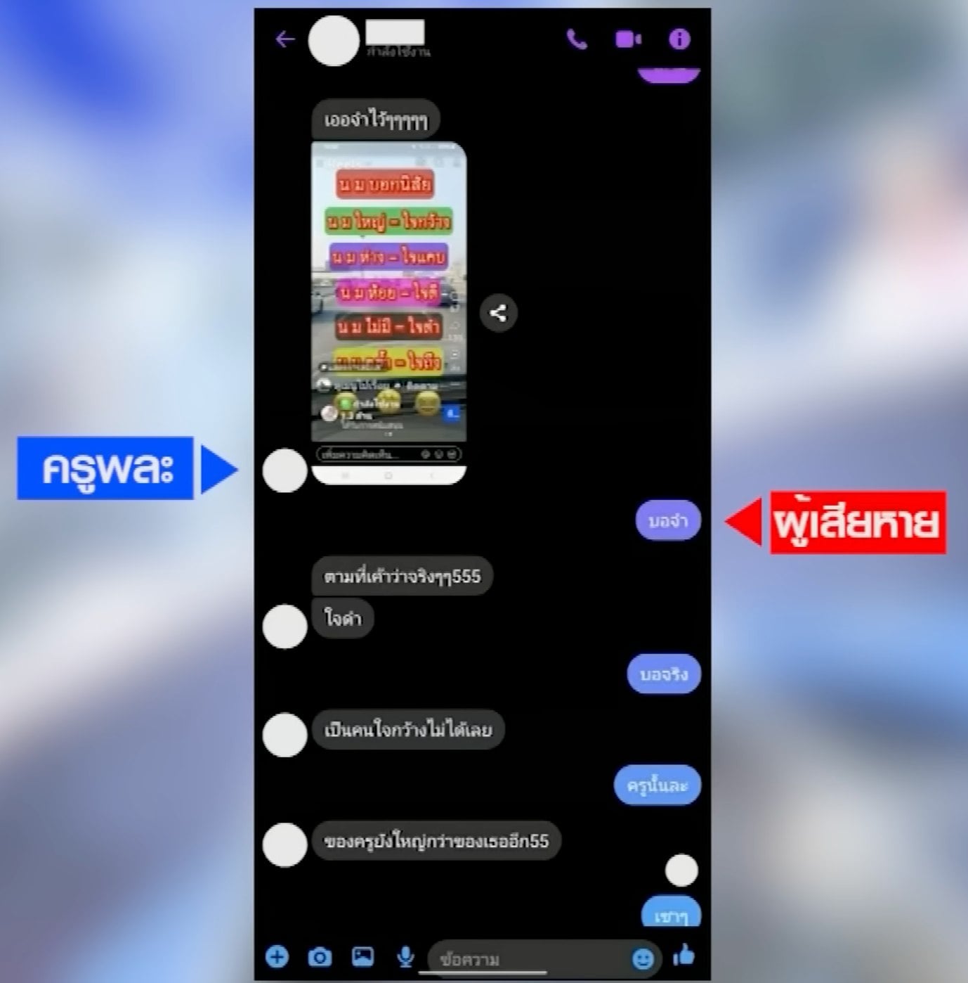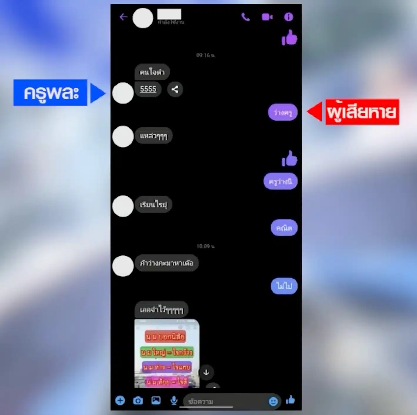 โดยเมื่อวันที่ 23 มี.ค. ที่ผ่านมา ในรายการเที่ยงวันทันเหตุการณ์ ได้เปิดเผยภาพบทสนทนาระหว่างครูพละรายดังกล่าวกับผู้เสียหายซึ่งเป็นนักเรียน ผ่านแอปพลิเคชันหนึ่ง ซึ่งเผยให้เห็นข้อความดังต่อไปนี้