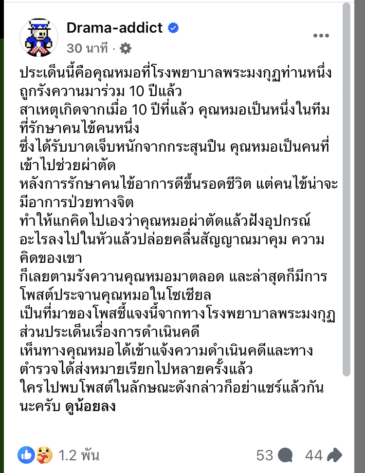 เกิดเหตุการณ์ แพทย์ท่านหนึ่งในโรงพยาบาลพระมงกุฎเกล้าโดนตามคุกคามจากอดีตคนไข้มาอย่างยาวนานถึง 10 ปี เพจเฟซบุ๊ก Drama-addict เปิดเผยข้อมูลว่าเรื่องราวที่มาที่ไป แพทย์ท่านนี้ทำหน้าที่เป็นหนึ่งในทีมผ่าตัดช่วยเหลือคนไข้ที่บาดเจ็บสาหัสจากกระสุนปืน