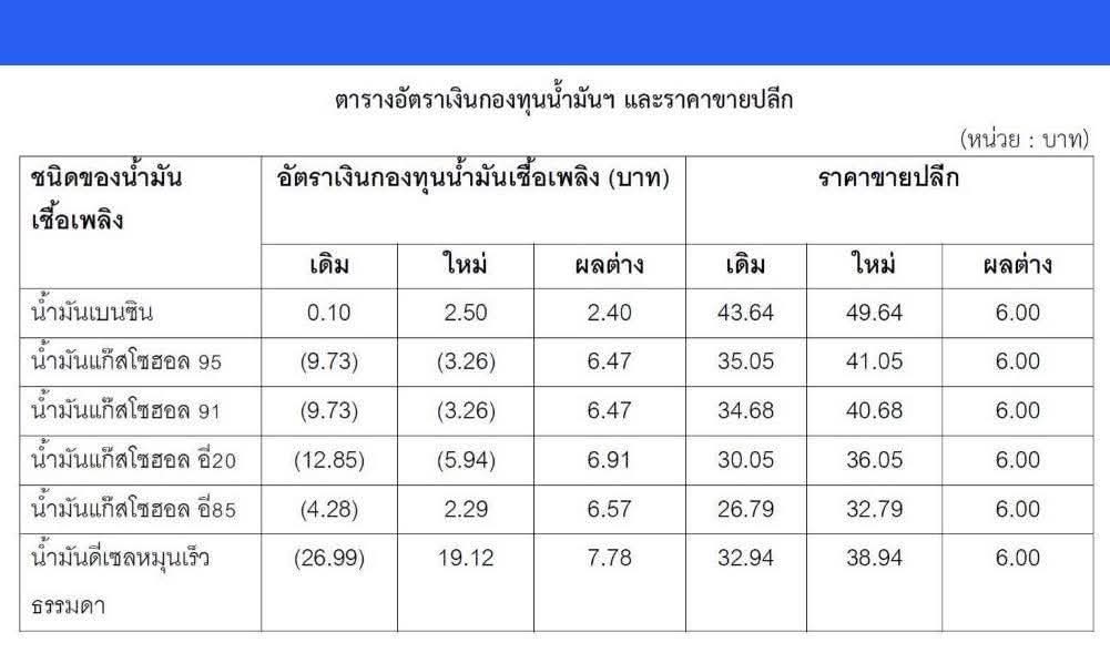 คณะกรรมการบริหารกองทุนน้ำมันเชื้อเพลิงมีมติให้ปรับลดการชดเชยราคาน้ำมัน การตัดสินใจครั้งนี้ทำให้ราคาขายปลีกน้ำมันดีเซลกับกลุ่มเบนซินทุกชนิดปรับตัวสูงขึ้น 6 บาทต่อลิตร