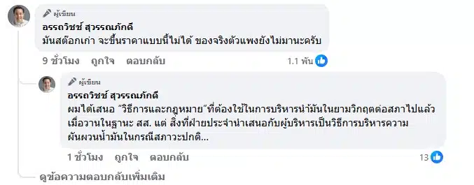 นอกจากนี้ยังระบุข้อความเพิ่มเติมว่า “มันสต๊อกเก่า จะขึ้นราคาแบบนี้ไม่ได้ ของจริงตัวแพงยังไม่มานะครับ ผมได้เสนอ “วิธีการและกฎหมาย”ที่ต้องใช้ในการบริหารน้ำมันในยามวิกฤตต่อสภาไปแล้วเมื่อวานในฐานะ สส. แต่ สิ่งที่ฝ่ายประจำนำเสนอกับผู้บริหารเป็นวิธีการบริหารความผันผวนน้ำมันในกรณีสภาวะปกติ”