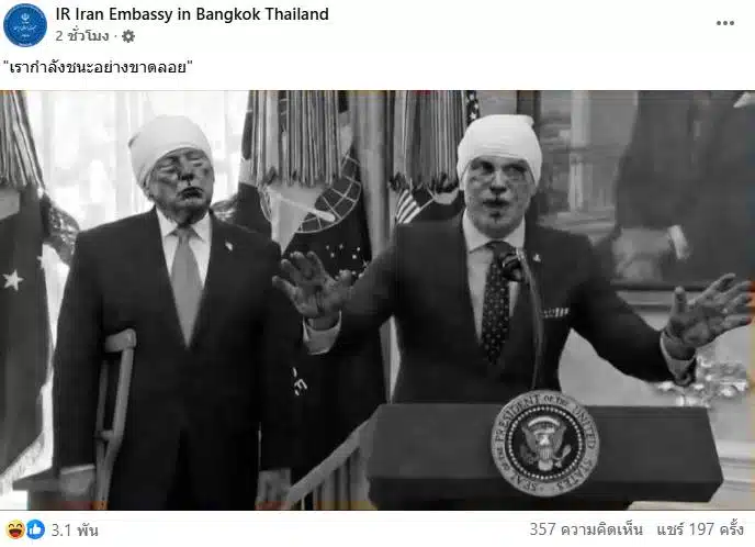 เพจเฟซบุ๊ก IR Iran Embassy in Bangkok Thailand ซึ่งเป็นเพจสถานทูตอิหร่านประจำกรุงเทพได้โพสต์ภาพล้อเลียนนายโดนัลด์ ทรัมป์ ประธานาธิบดีสหรัฐฯ โดยตัดต่อในสภาพใส่เฝือกและได้รับบาดเจ็บ พร้อมเขียนข้อความข้อเลียนว่า “เรากำลังชนะอย่างขาดลอย”