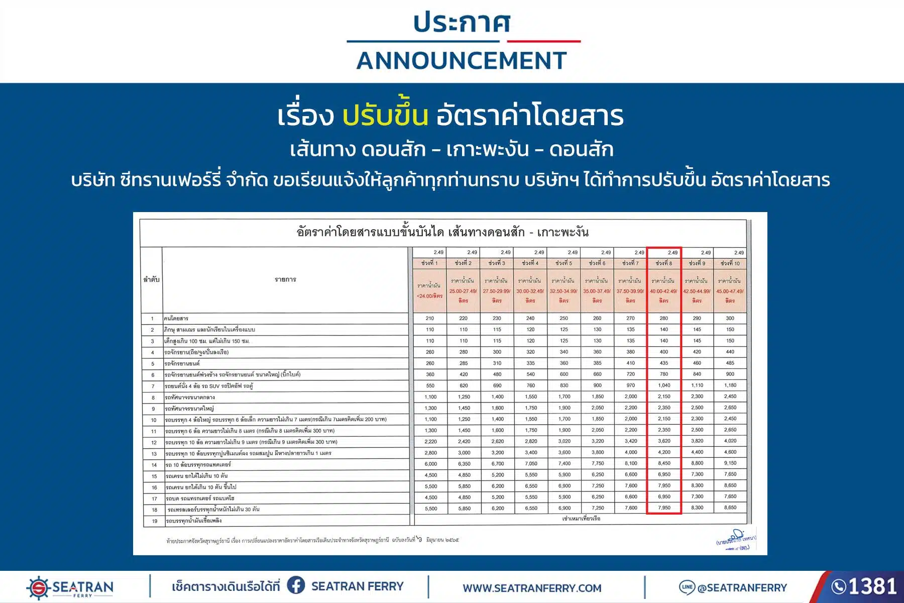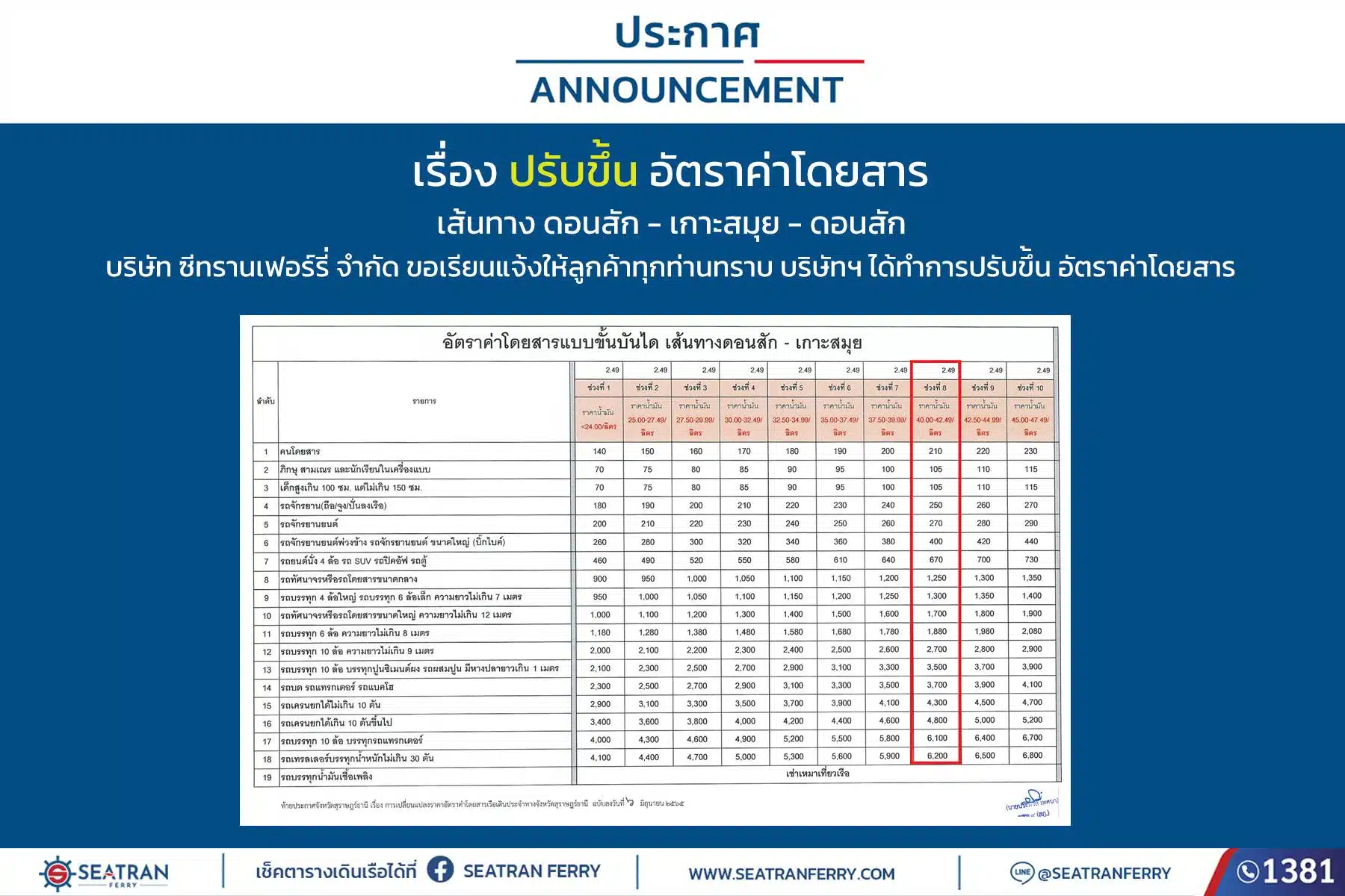 อัตราค่าโดยสารแบบขั้นบันได เส้นทาง ดอนสัก – เกาะสมุย – ดอนสัก (อ้างอิงช่วงราคาน้ำมัน 40.00-42.49 บาท/ลิตร) บริษัท ซีทรานเฟอร์รี่ จำกัด