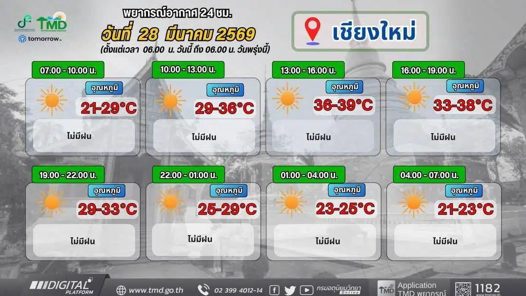 กรมอุตุนิยมวิทยา เปิดเผยพยากรณ์สภาพอากาศช่วงวันที่ 28 มี.ค. – 3 เม.ย. 69 สำหรับประเทศไทยตอนบนมี “อากาศร้อนโดยทั่วไป” และมี “อากาศร้อนจัดบางพื้นที่”