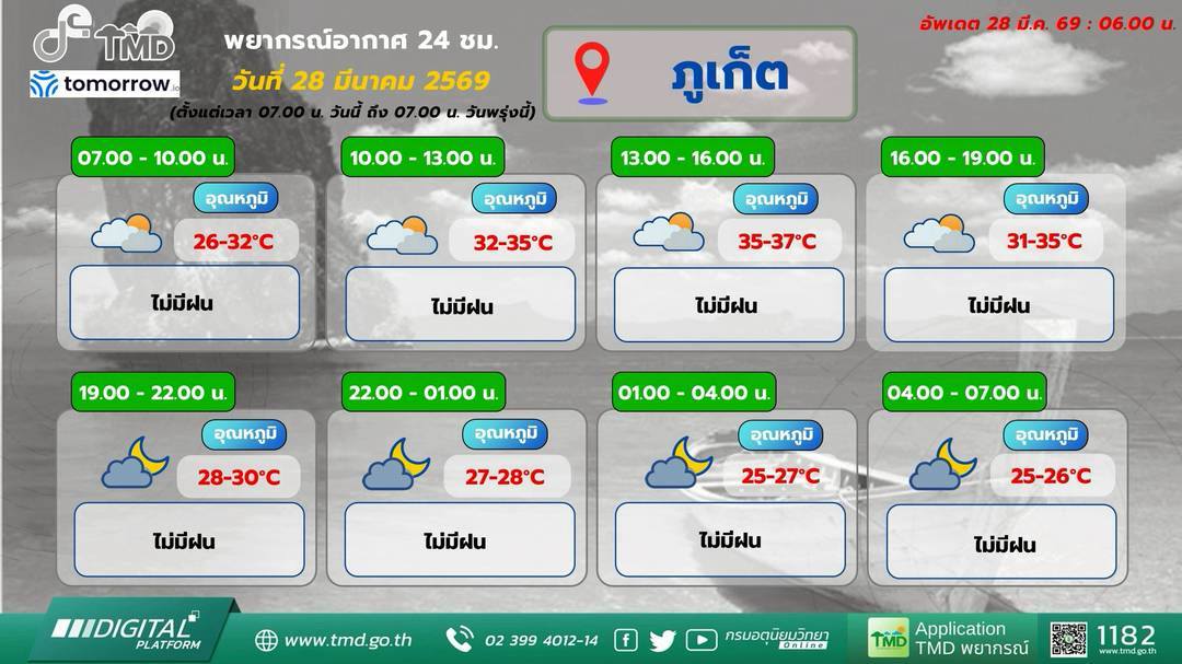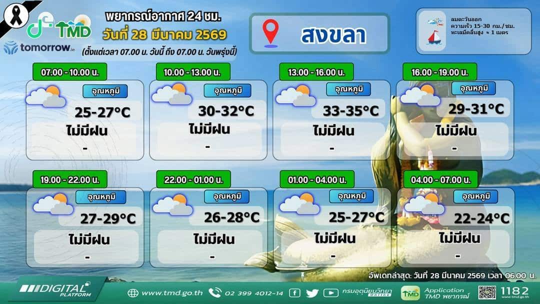 ภาคใต้ในช่วงวันที่ 28 – 29 มี.ค. 69 มีฝนน้อยและมีอากาศร้อนในตอนกลางวัน เนื่องจากลมตะวันออกและลมตะวันออกเฉียงใต้กำลังอ่อนพัดปกคลุมอ่าวไทย ภาคใต้ และทะเลอันดามัน บริเวณอ่าวไทยและทะเลอันดามันมีคลื่นสูงประมาณ 1 เมตร บริเวณที่มีฝนฟ้าคะนองคลื่นสูงมากกว่า 1 เมตร